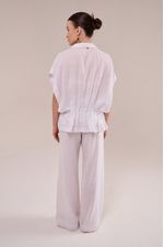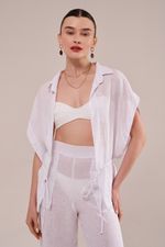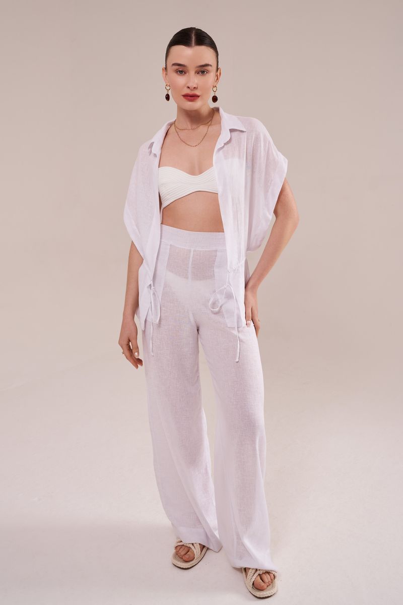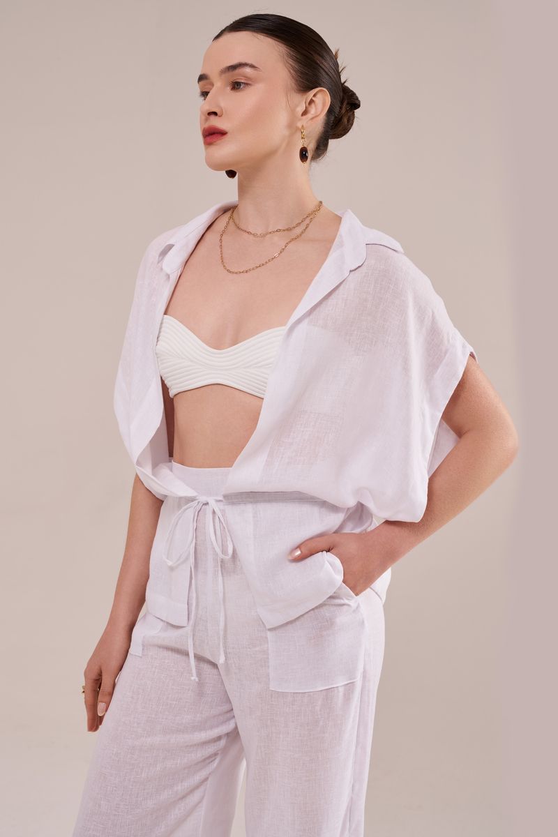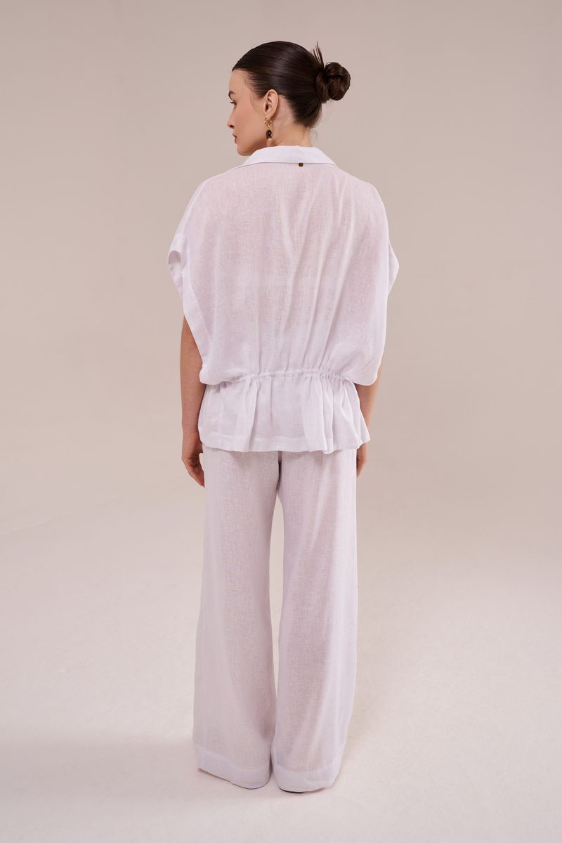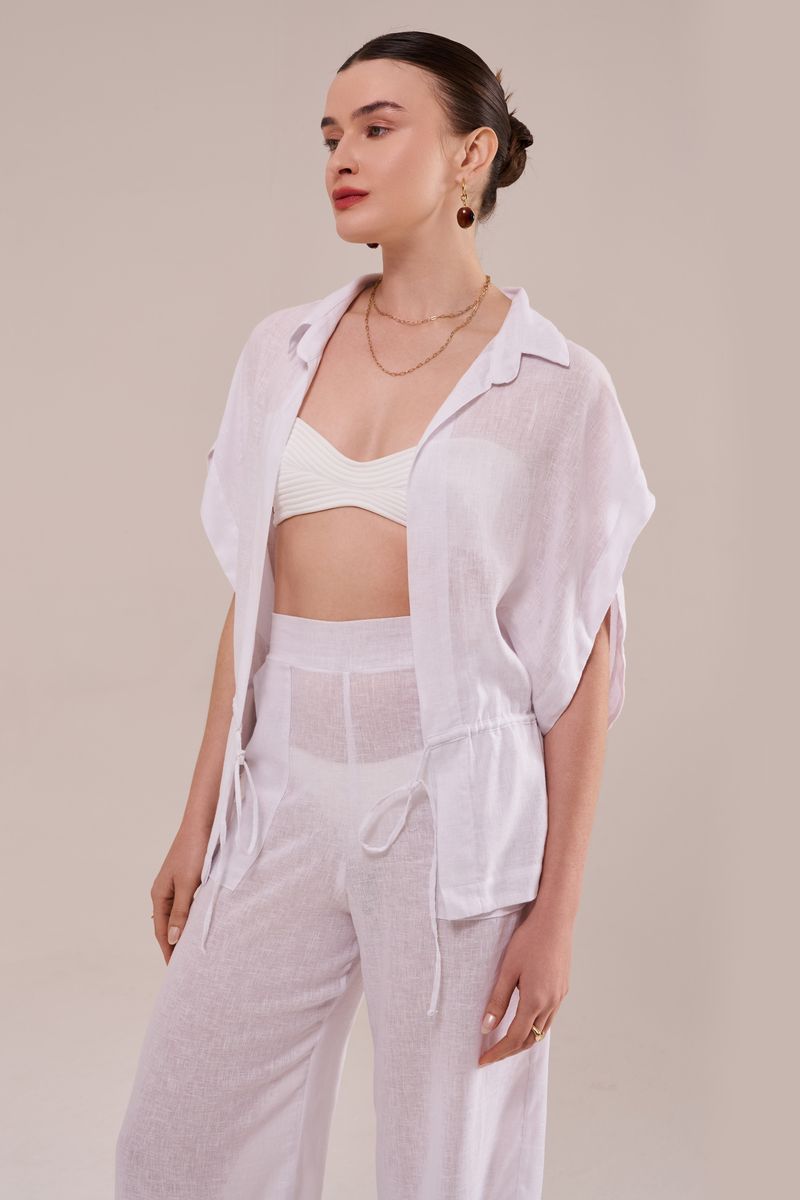 bata de modelagem super ampla, com gola clássica, confeccionada em tecido de linho com viscose branco. possui fechamento por amarração na cintura. pode ser usada como colete e saída de praia. fica lindíssima com a calça da mesma coleção. um conjunto lindo e fresquinho para passeios especiais de verão!