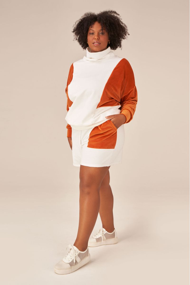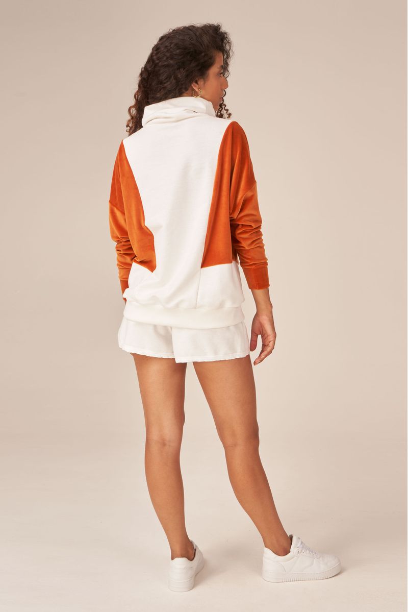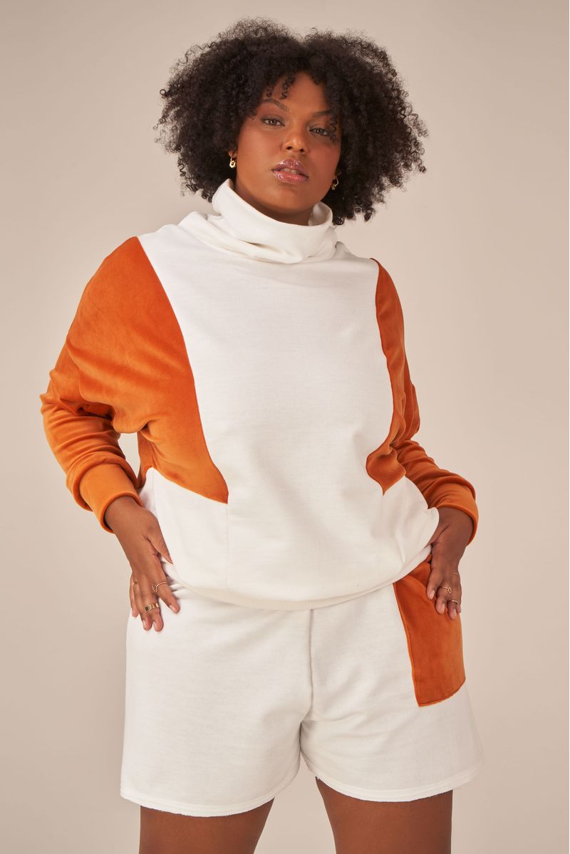 Blusa moletom modelagem ampla e mangas raglan, com recorte de tecido de veludo caramelo. Gola alta, punhos no cós e nas mangas. O algodão é certificado pelo órgão Better Cotton Iniciative, minimizando o impacto no meio ambiente.