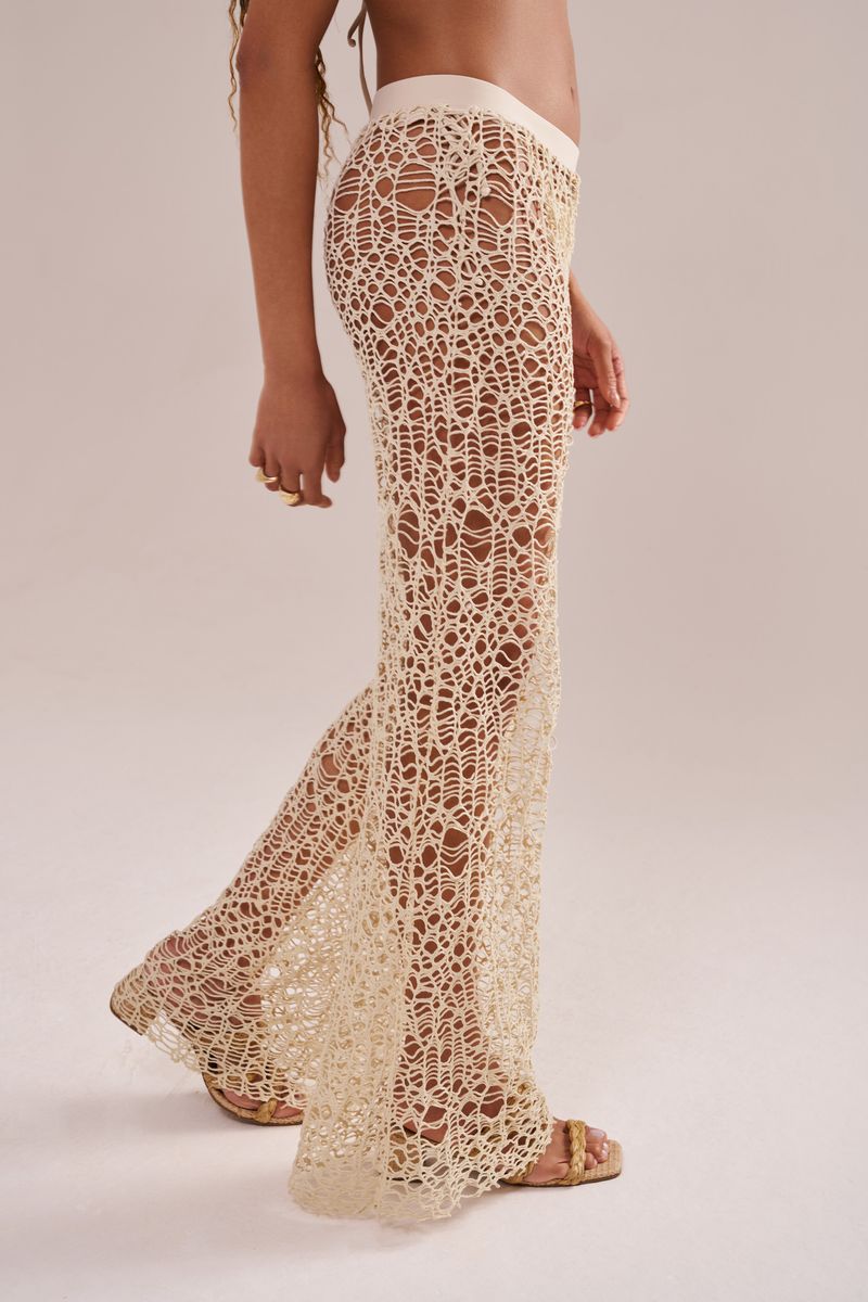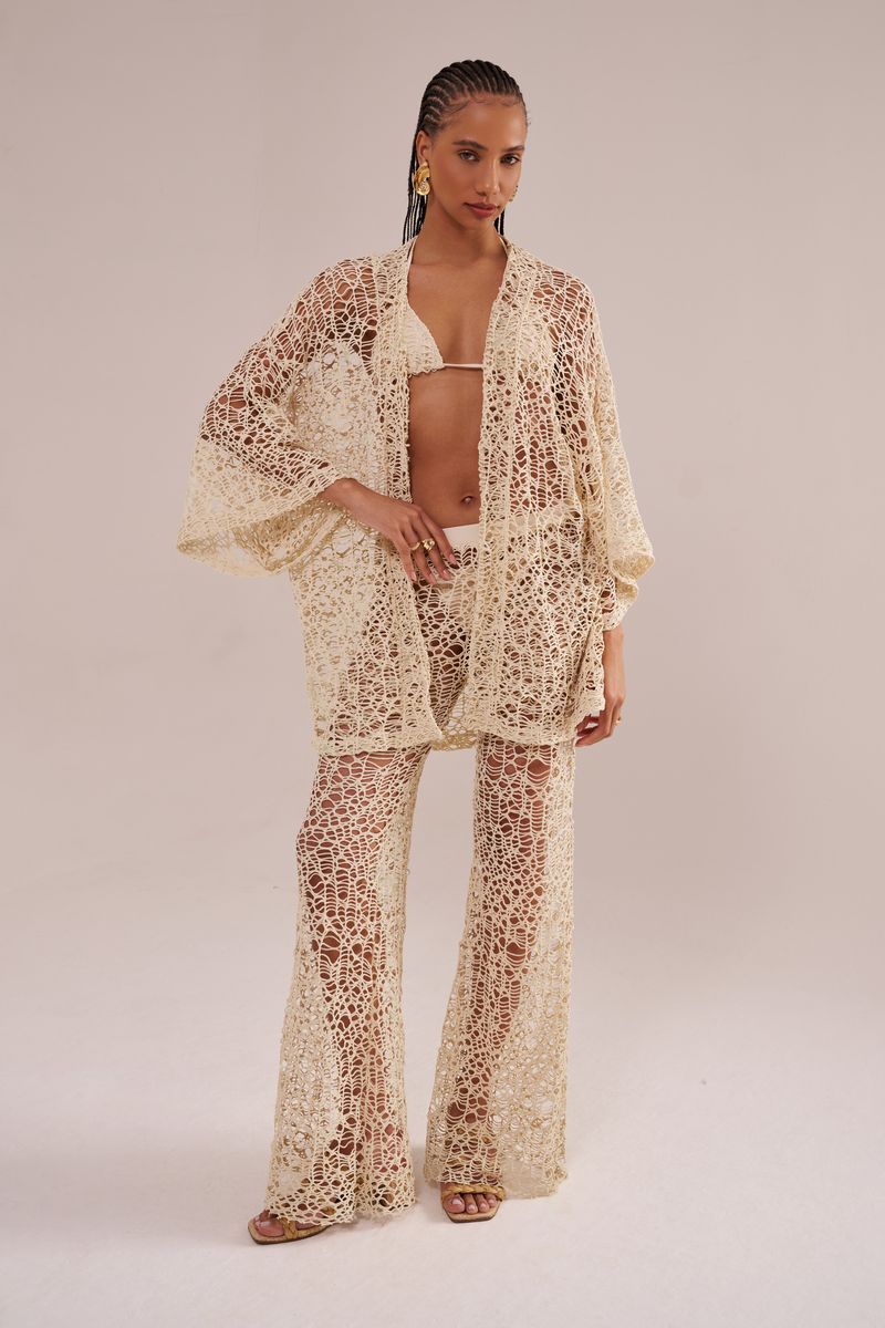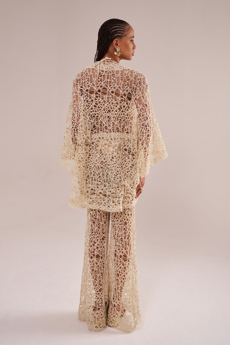 • a modelo veste P • cintura com elástico • modelagem wide calça de modelagem ampla wide, confeccionada em tecido com trama especial com efeito crochê. possui elástico na cintura e comprimento super longo. perfeita como saída de praia e se combinada com o kimono da mesma coleção. pode ser usada em outras ocasiões se usada com legging por baixo.