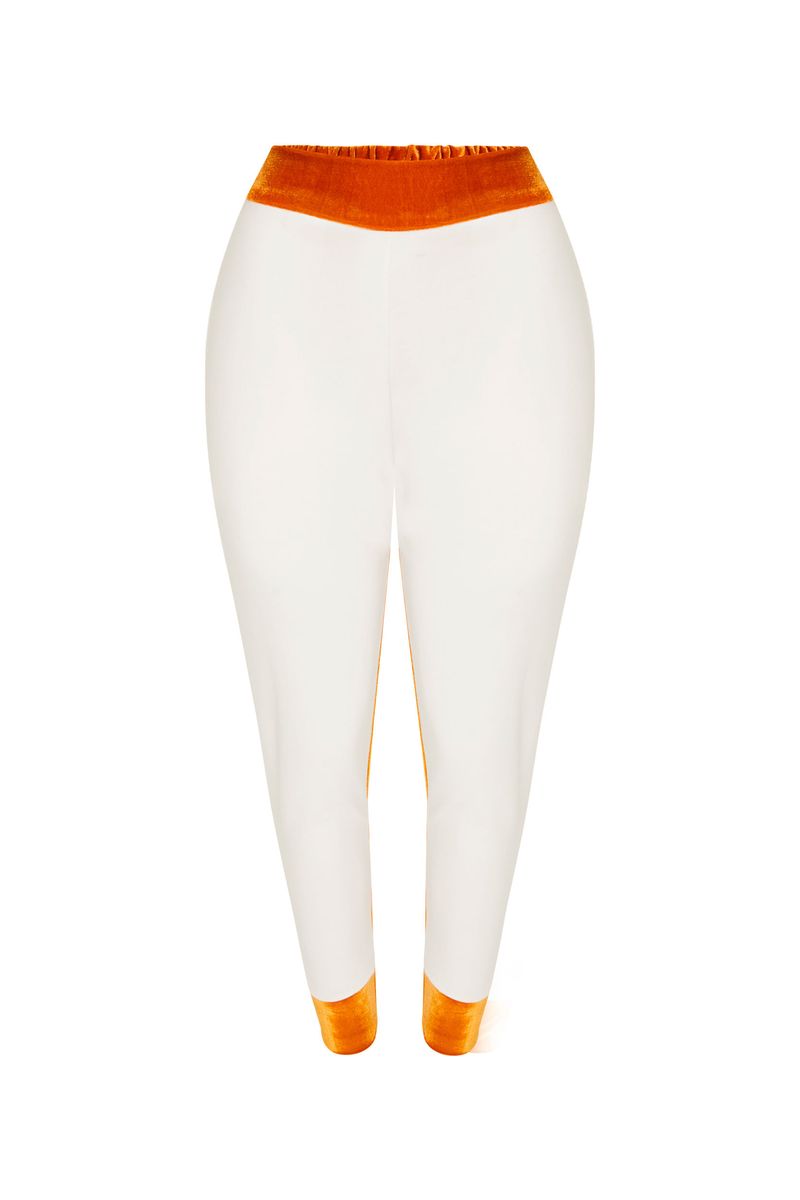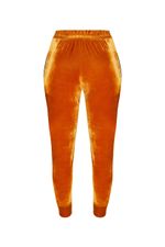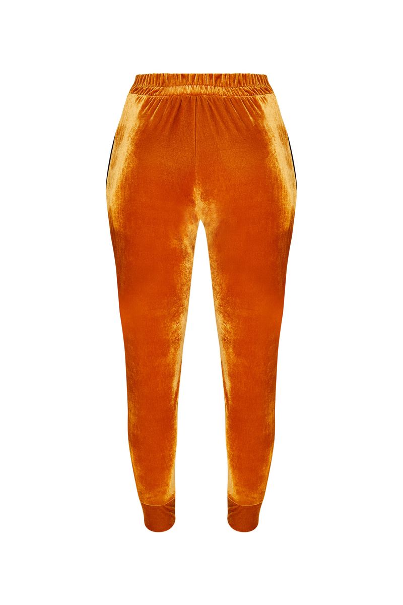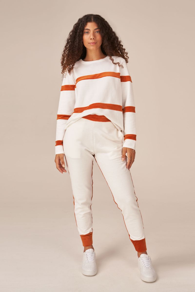 Calça Jogger de moletom com a parte traseira bicolor em veludo no tom caramelo. Uma calça pensada para ser usada em momentos de total conforto. Possui elástico na cintura, e punho na barra.