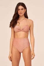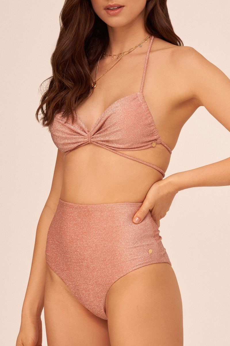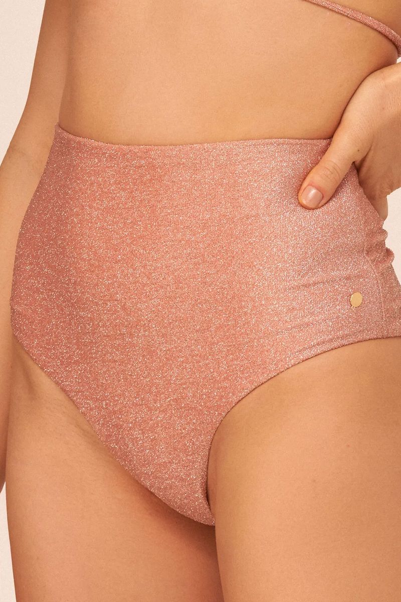 Hot pant com cintura alta e tecido de lurex com brilho. A cor pêssego é um lindo tom para o verão.