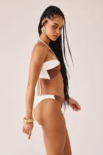 Calcinha de biquini marrom cappuccino midi cintura alta, possui detalhe feito em matelassê feito a mão: linha a linha, costura a costura, esta peça é uma verdadeira obra da altura costura do swimwear.