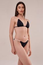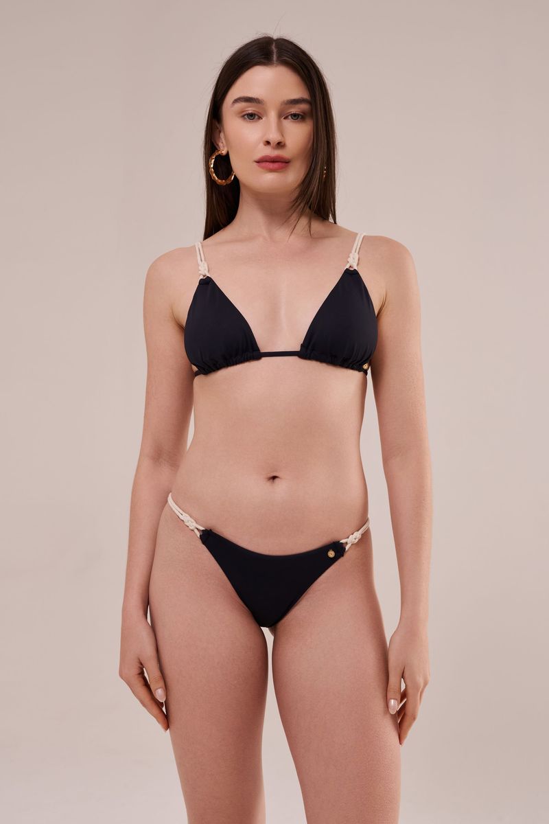 calcinha biquíni string mini, confeccionada em tecido biodegradável preto com proteção solar UV50+, possui toque gelado, lateral fixa com cordão elástico de algodão com detalhe delicado em macramê feito a mão. possui ainda costura franzida atrás o que confere à peça melhor caimento no bumbum. uma belíssima peça feita em homenagem à nossa brasilidade.