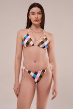 calcinha biquíni modelo string gisele com amarração lateral, confeccionada com a técnica de upcycling, onde cada cor de tecido e cortada e costurada uma a uma artesanalmente, unidas através de um patchwork manual. um trabalho exclusivo e incrivelmente rico em detalhes. uma verdadeira joia do beachwear!