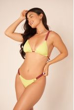 top triângulo com bojo e alças trabalhadas em matelassê. calcinha mini com menor cobertura no bumbum e laterais trabalhadas em matelassê. o contraste das cores azul céu e páprica deixa o conjunto mais vibrante e solar.