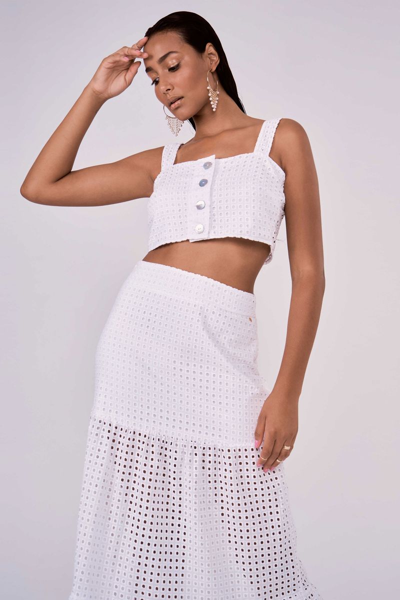 conjunto com top e saia longa todo em laise. A laise é feita em 100% algodão, leve e respirável, com bordados vazados, super charmosa com desenho geométrico. a saia de camadas longa acompanhada to top de alças largas e acabamento de botão de madrepérola. atemporal e jovial, este conjunto fica lindo para ser usado em qualquer ocasião.