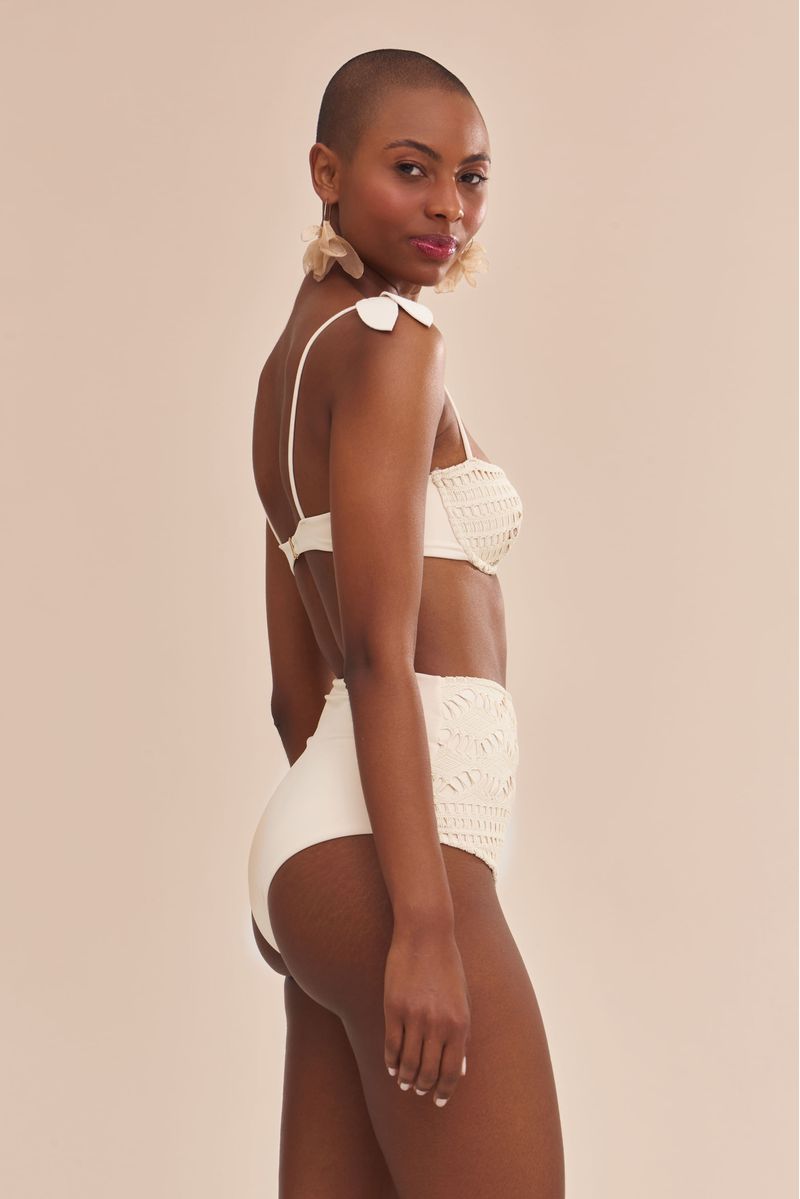 Top balconet com aro contínuo e sem bojo. Alças fixas com detalhes de folhas de magnólia. A hot pant é puro charme! Com modelagem fio, mas laterais largas, ela veste muito bem qualquer biotipo. Em tecido especial de macramê, esta peça é elegante nas duas variantes: areia e off-white. O tecido é trabalhado e tem detalhes vazados como um macramê. Nas cores off-white e areia, esta peça é fina e delicada.
