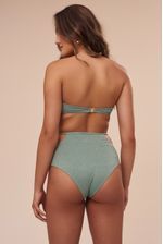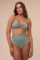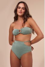 A hot pant da coleção Serena compõe o conjunto. Ela tem como detalhe uma argola de metal verde nas laterais presas por uma tira bem fina, um design moderno para uma peça clássica. A modelagem é super confortável, com cintura alta e cobertura maxi do bumbum, ficando elegante em qualquer biotipo.