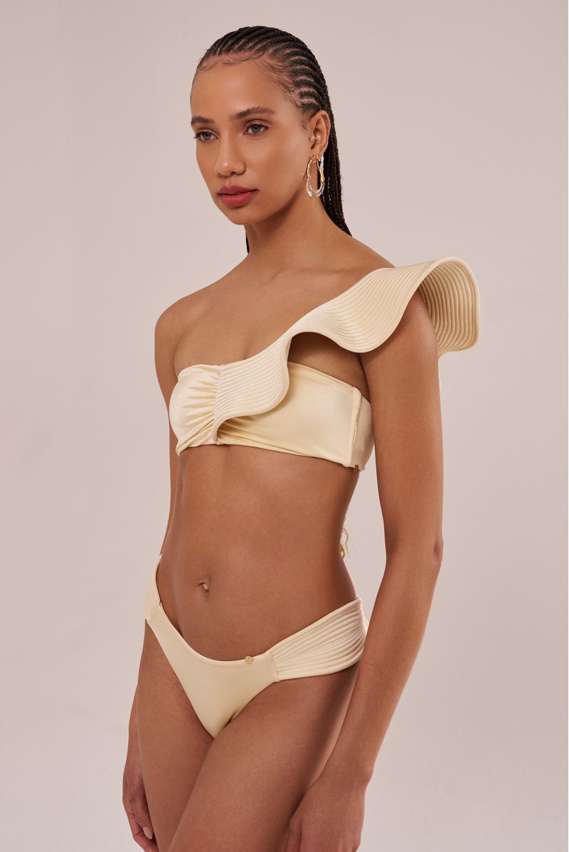 conjunto de biquini top feito em detalhe de alça jabour que remete às falésias do nosso litoral. possui fecho traseiro em banho dourado, vai bem para seios pequenos a médios. calcinha com cobertura midi e laterais em matelassê. fica elegante e veste todos os tipos de quadril. feita artesanalmente, essa peça é costurada linha a linha, costura a costura, formando este visual único de ondas no matelassê.