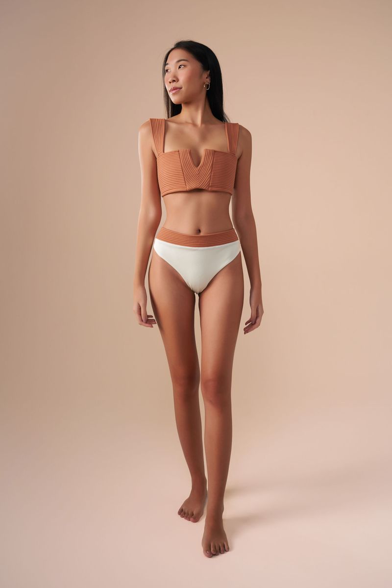 o top reto V todo em matelassê é a peça fashion must-have desta coleção. muito além de um top de beachwear, esta peça transita facilmente da areia para a balada e, se composta com uma calça cintura alta ou um blazer, este item pode ser usado de forma bem versátil no guarda-roupa. escolhemos produzi-lo em um tom único: ou todo preto, ou todo caramelo. todo trabalhado no matelassê, é uma peça artesanal, estruturada, que leva horas para ser costurada, ou seja, este top é praticamente uma peça de alta costura. as alças possuem regulagem e o fecho traseiro é em banho dourado. a calcinha midi da coleção contour tem uma modelagem diferente e muito interessante. a base do cós em matelassê é confeccionada em tom contrastante. já o bumbum possui costura anatômica e traseiro duplo sem elástico, vestindo de forma mais confortável e deixando a silhueta mais bonita. nem tão alta e nem muito baixa, esta calcinha tem uma modelagem mediana que veste bem todos os biotipos.