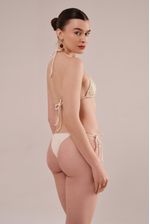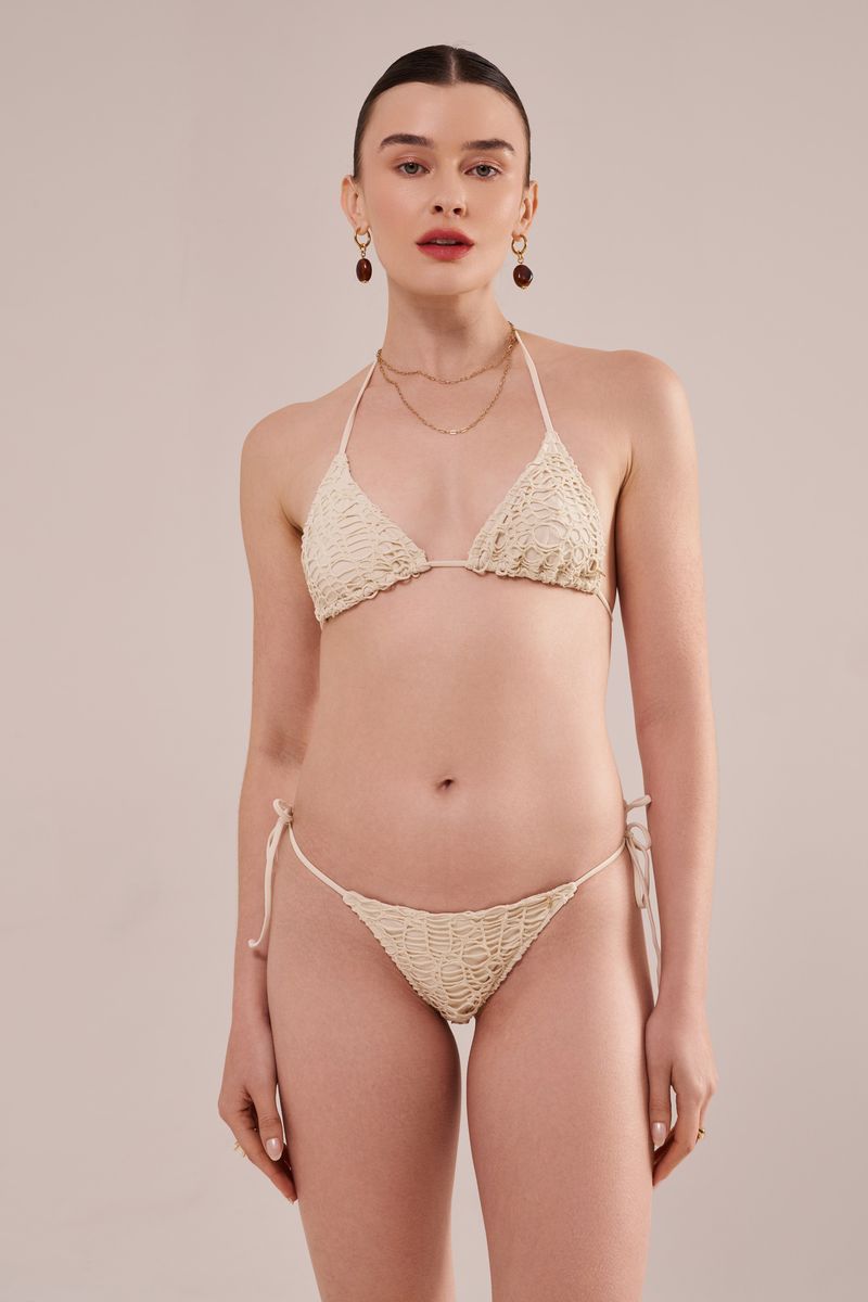 • a modelo veste P • top biquíni sem bojo • amarração pescoço e costas • calcinha biquíni cobertura mini • amarração lateral conjunto top biquíni triângulo cortininha, confeccionado em tecido com trama especial com efeito crochê, alças finas e fechamento por amarração no pescoço e nas costas. possui forro duplo para evitar transparência. calcinha biquíni modelo string, confeccionada em tecido com trama especial com efeito crochê, alças finas e fechamento por amarração no pescoço e nas costas. possui forro duplo para evitar transparência.