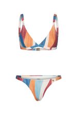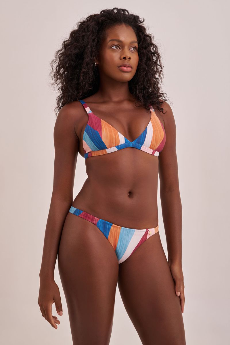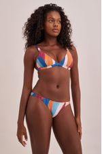 Conjunto de top modelo triângulo estampado. A estampa exclusiva Brisa, tem um desenho abstrato que mistura tons mais sóbrios como vinho, azul e tons alaranjados. Sem bojo, com alças reguláveis e cós fixo. Este topo é indicado para seios pequenos a médios. O fecho nas costas é de encaixe e revestido com banho dourado. Calcinha mini Brisa, com cobertura média no bumbum e alças mais finas nas laterais, essa peça é feita na estampa abstrata exclusiva Brisa tem um desenho que mistura tons mais sóbrios como vinho, azul e tons alaranjados. Veste bem qualquer tipo de quadril.