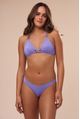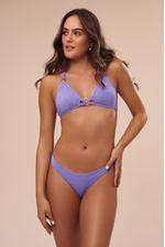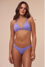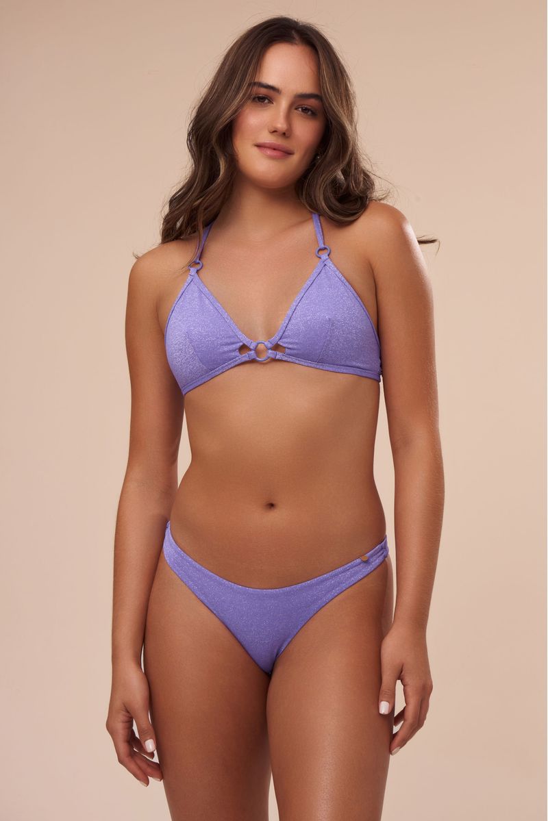 Conjunto Top triângulo com bojo removível na cor lavanda, uma cor fascinante, e fios prateados de lurex que deixam a peça com um brilho suave. Possui alças finas e detalhe nas costas de três argolas de metal na mesma tonalidade, combinando com a cor do tecido e formando um desenho lindo e sexy.