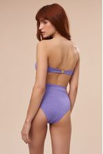 A hot pant da coleção Serena tem como detalhe uma argola de metal roxa nas laterais presas por uma tira bem fina, um design moderno para uma peça clássica. A modelagem é super confortável, com cintura alta e cobertura maxi do bumbum, ficando elegante em qualquer biotipo. O tecido possui fios prateados de lurex que deixam a peça com um brilho suave. A cor lavanda é simplesmente fascinante!