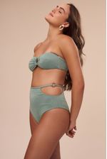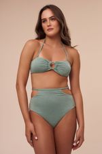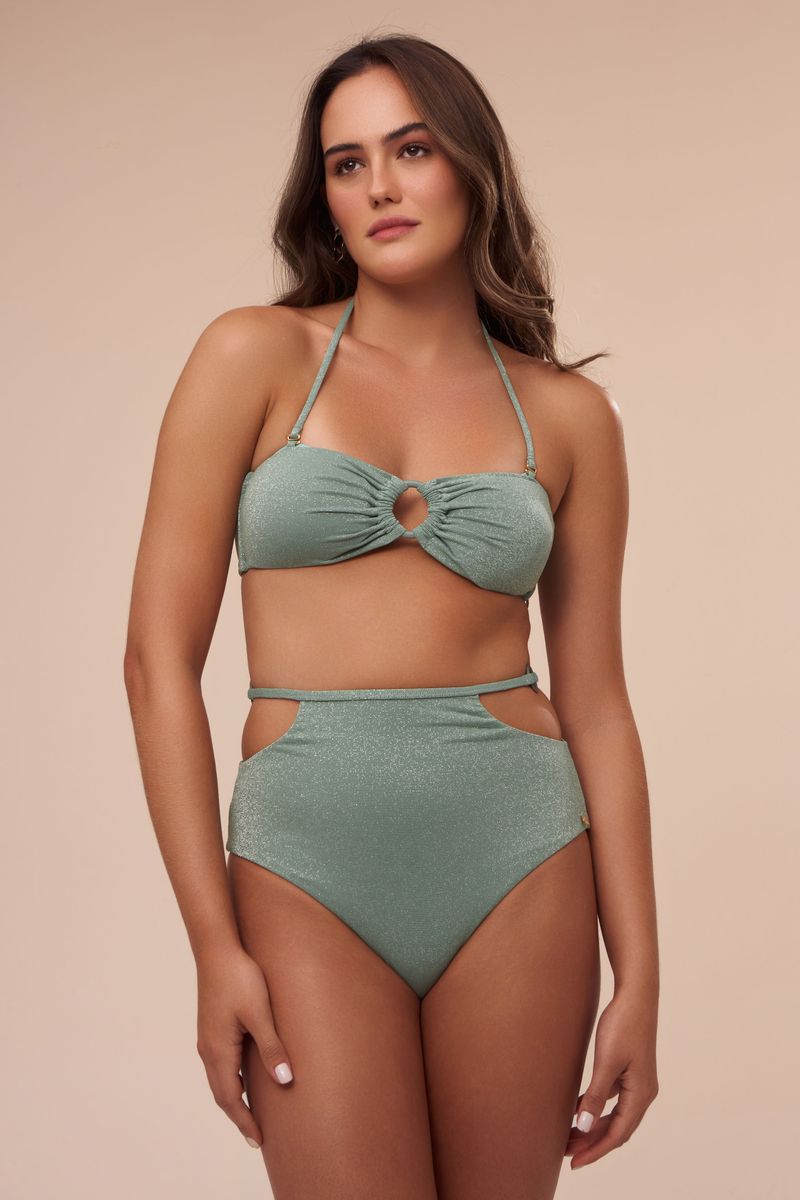 A hot pant da coleção Serena tem como detalhe uma argola de metal verde nas laterais presas por uma tira bem fina, um design moderno para uma peça clássica. A modelagem é super confortável, com cintura alta e cobertura maxi do bumbum, ficando elegante em qualquer biotipo. O tecido possui fios prateados de lurex que deixam a peça com um brilho suave. A cor menta é calma e agradável.