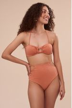 A hot pant da coleção Serena tem como detalhe uma argola de metal laranja nas laterais presas por uma tira bem fina, um design moderno para uma peça clássica. A modelagem é super confortável, com cintura alta e cobertura maxi do bumbum, ficando elegante em qualquer biotipo. O tecido possui fios prateados de lurex que deixam a peça com um brilho suave. A cor papaya é leve e graciosa.