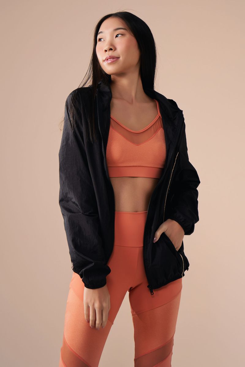 A jaqueta corta-vento preta é moderna, e prática. Possui bolsos frontais com zíper, o vivo nas costas, e na silhueta frontal, além de charmosos, são dourados. Possui capuz com elástico para ajustar ao rosto e punhos elásticos com manga-luva.