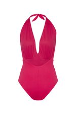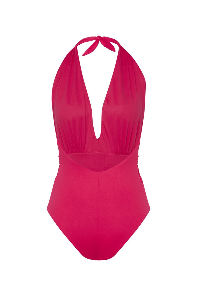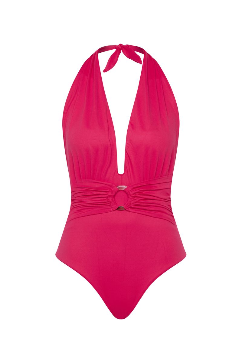 esse maiô é uma peça ousada e elegante. com decote profundo, costas nuas, e detalhe de franzido frontal com acabamento em uma argola.