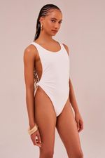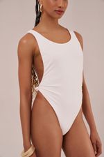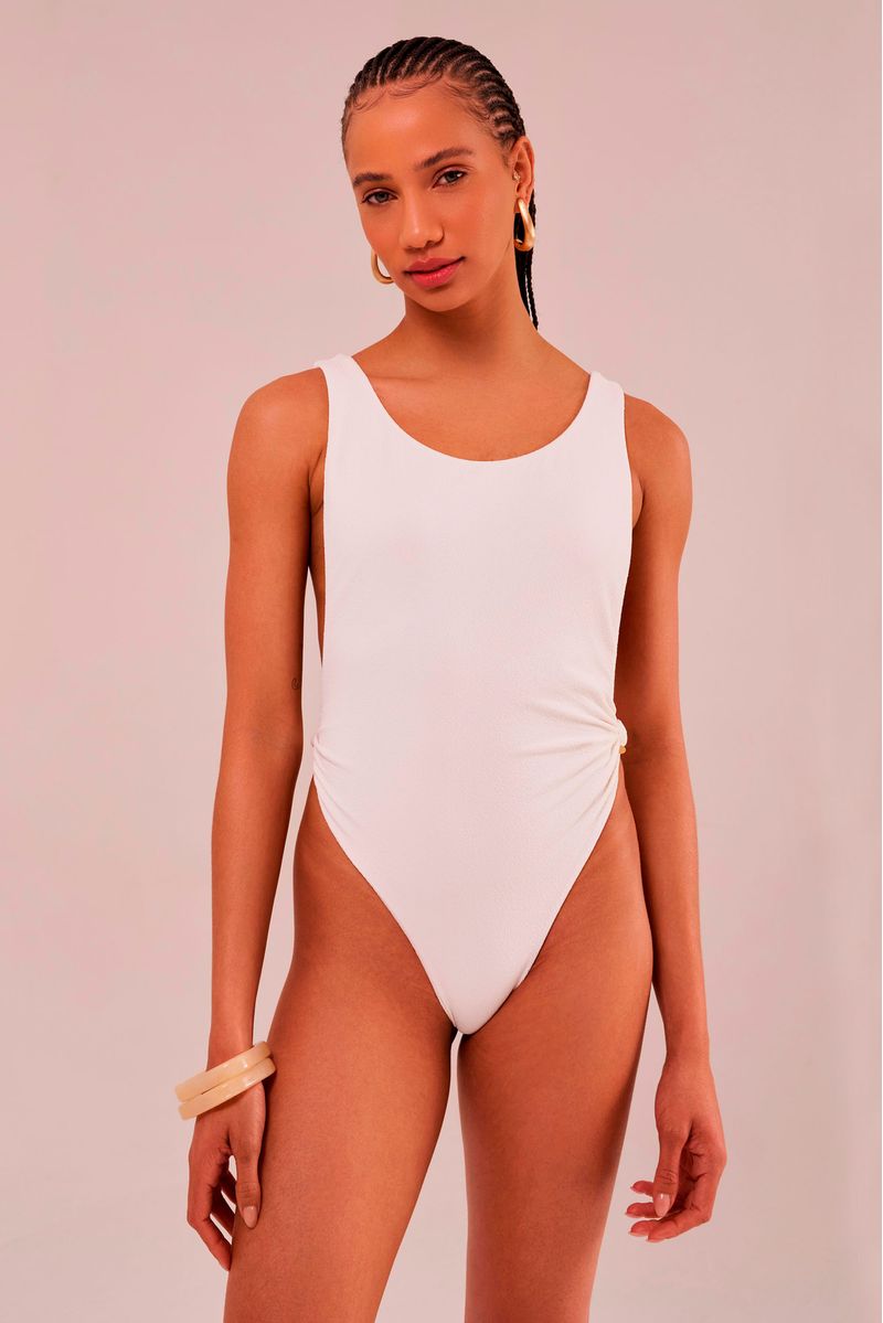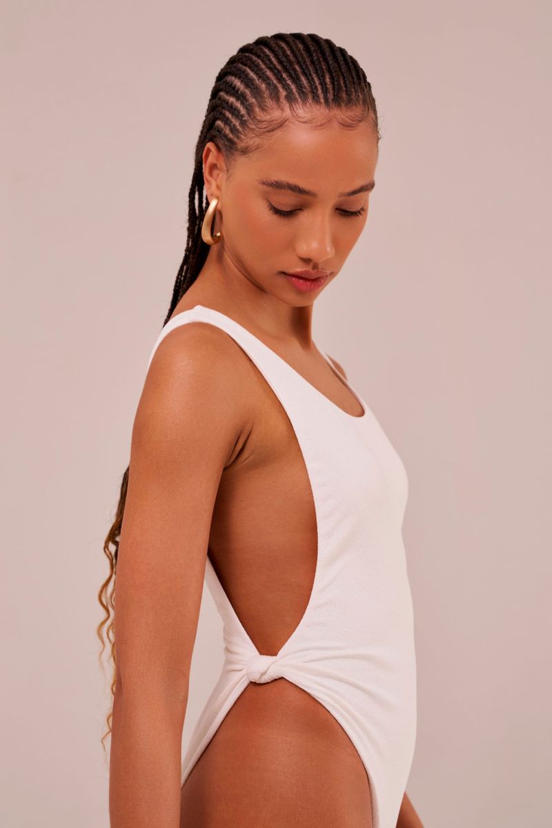 maiô com nó sem bojo, decote profundo nas costas, recortes laterais no busto e cavas acentuadas nas pernas. o detalhe de um nó na lateral adiciona um toque de charme e sofisticação à peça. pode ser usado como body ou maiô e transita tranquilamente da areia ao asfalto, quando combinado com shorts, saia ou calça.