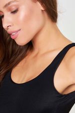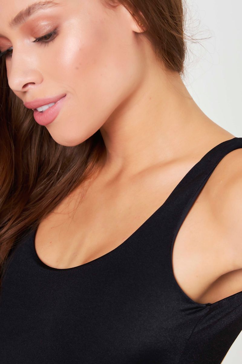 Maiô body de alças médias com decote profundo traseiro e sem bojo. Deixa o corpo com uma silhueta linda e é super confortável. Seu tecido tem um leve e delicado brilho e preto é um coringa para se ter no guarda roupa.
