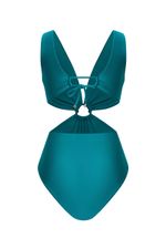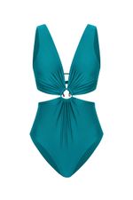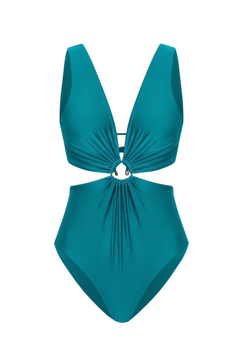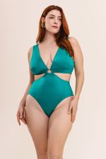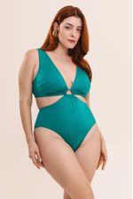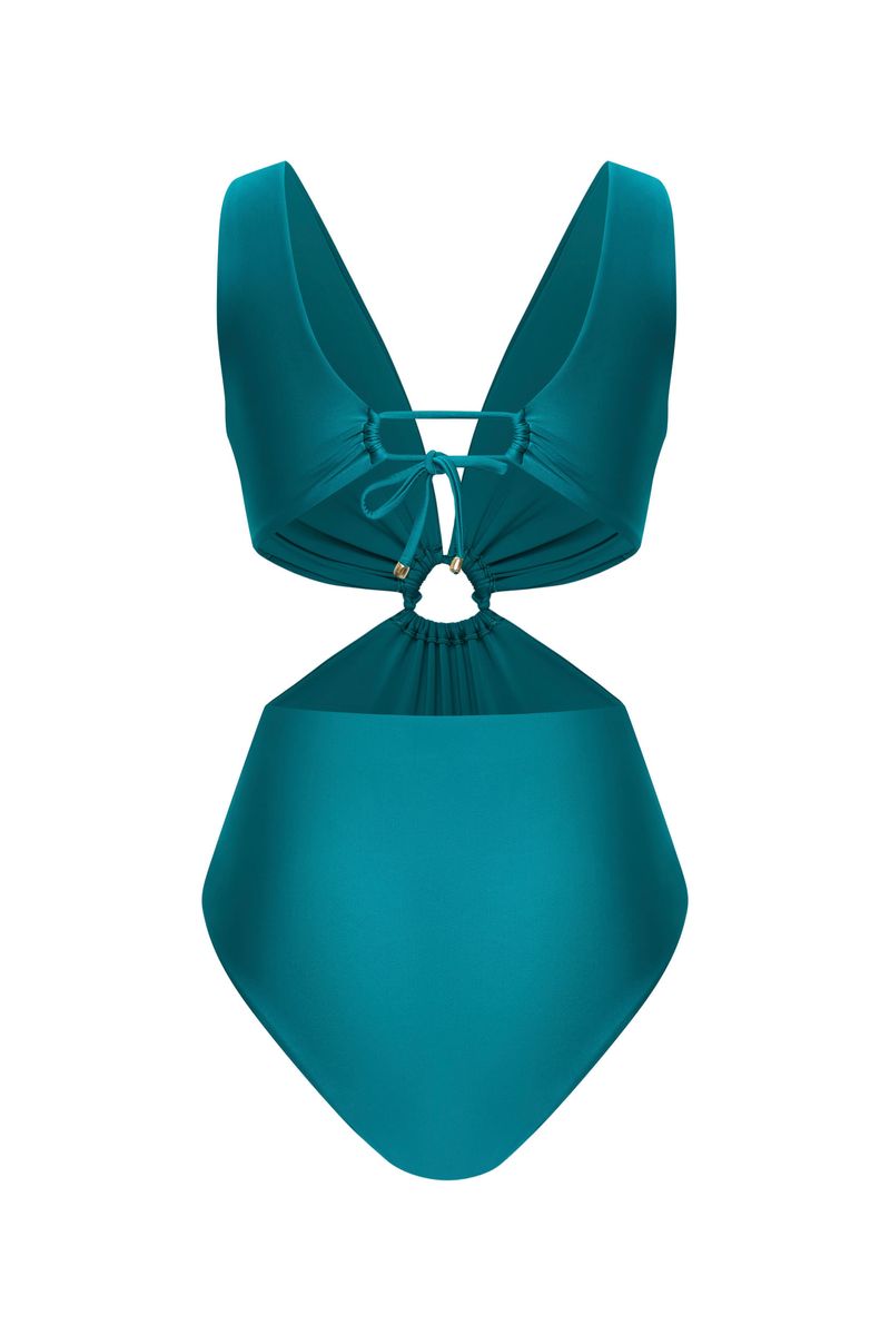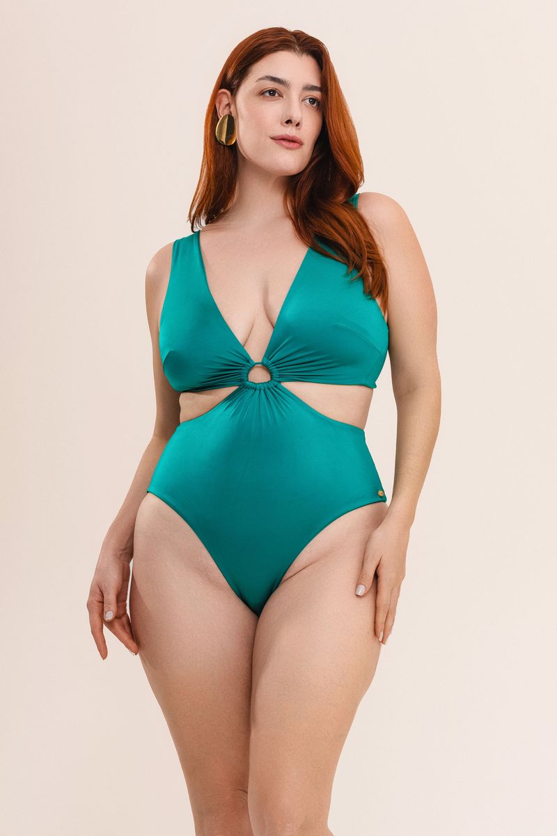 este maiô é uma peça elegante e sensual com decote frontal profundo, além de recortes laterais e detalhes franzidos presos por uma tira de tecido na cor verde. para arrasar na areia!
