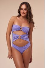 Maiô tomara que caia com alças removíveis e recortes frontais ousados. Possui duas argolas de metal na cor roxa, tornando o maiô mais interessante. O tecido possui fios metálicos que deixam a peça com um brilho suave. No tom fascinante lavanda.