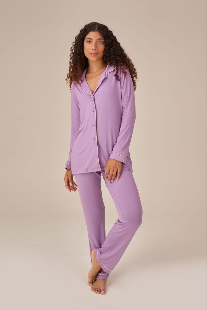 O pijama Classic como o nome próprio já diz, é um pijama atemporal. Sua modelagem clássica é elegante e cheia de conforto. Todo em viscolycra com detalhes de vivos contrastantes. Fechamento com botões. O conjunto com manga longa e calça é ideal para meia estação ou inverno. A cor tulipa é um tom liláceo que vai bem com qualquer tom de pele, além de ser cor tentência da estação.
