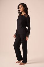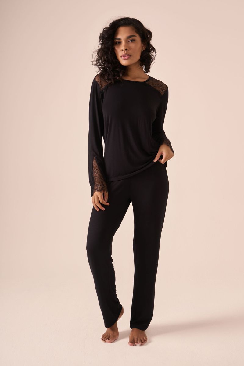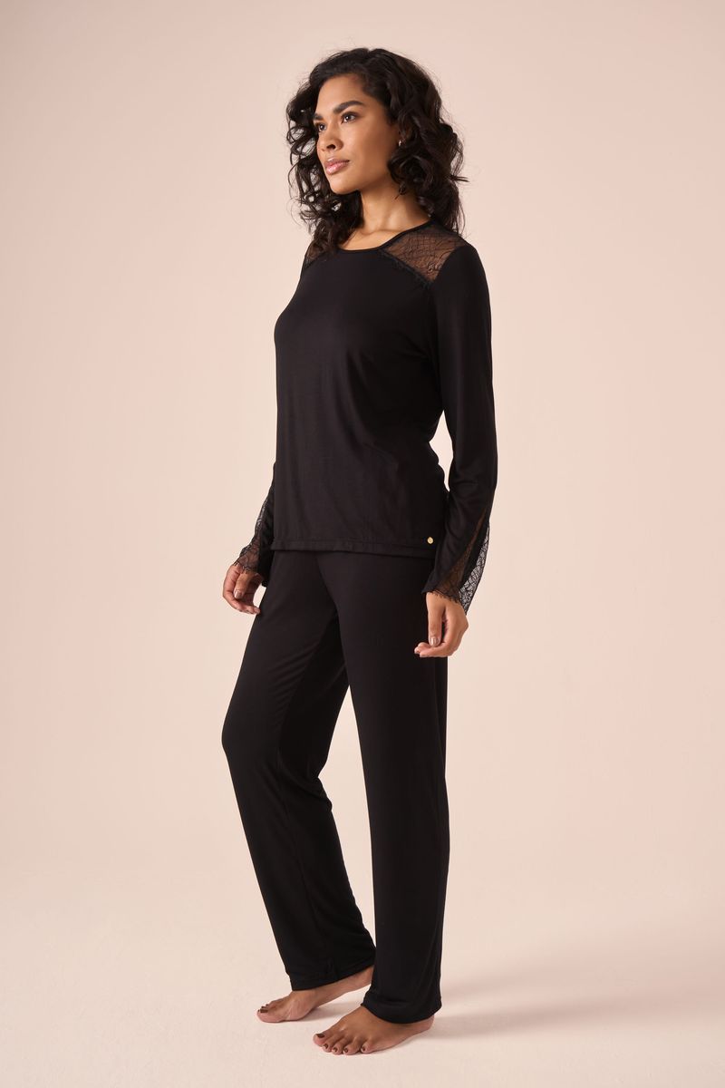 o pijama longo nuit é puro charme. Nas barras das mangas, o detalhe da renda chantilly com franja destaca a pele e o punho. uma peça super confortável feita a partir de malha de viscose sustentável e livre de amaciantes químicos. A calça possui uma modelagem mais reta, acabamento de elástico no cós.