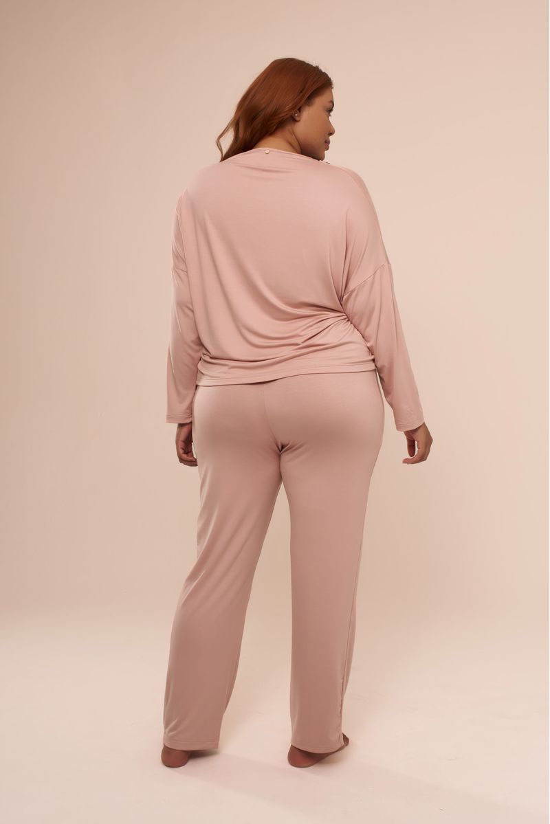 Pijama manga longa básico feito em malha com acabamento de renda recortada no decote. A calça é reta e básica. Veste todos os biotipos, é um conjunto confortável e meia estação. O tom rosa chá com a renda contrastante na cor preta deixou a coleção sweet ainda mais romântica.