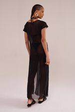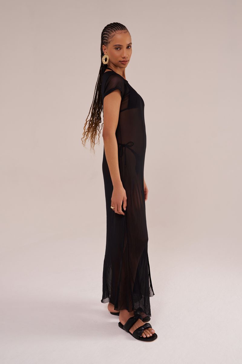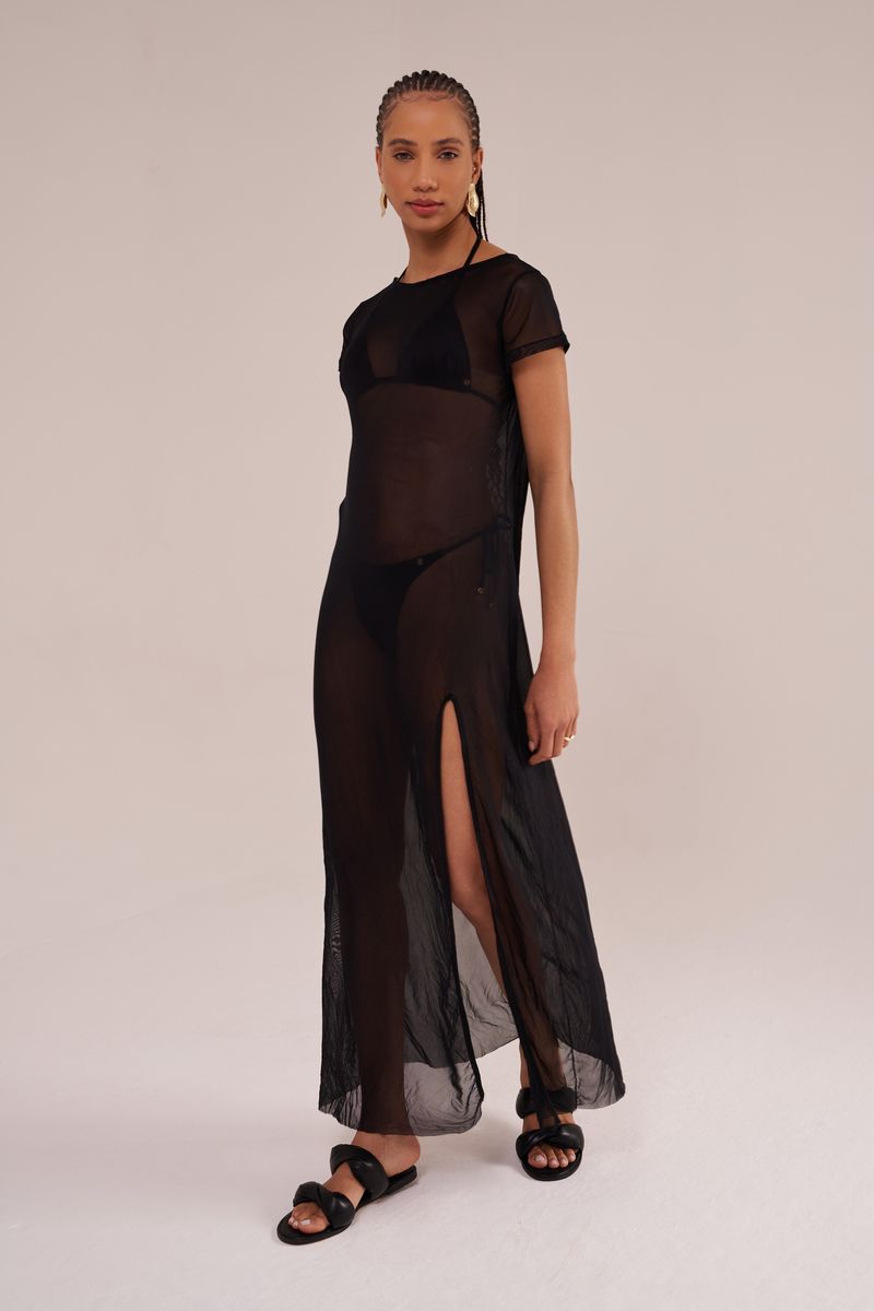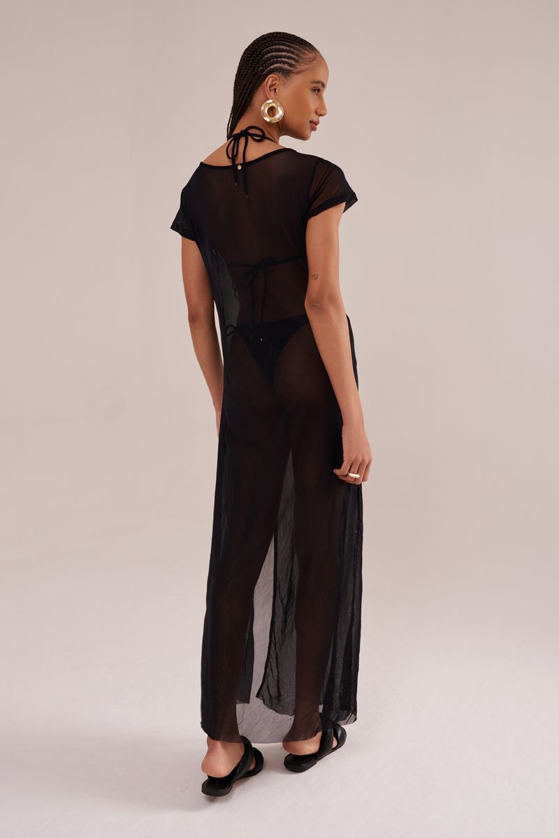 saída de praia longa, manga curta, decote canoa, confeccionada em tecido tule preto. possui fenda lateral, transparência e secagem rápida. perfeita para completar todos os looks de verão da mala de viagem.