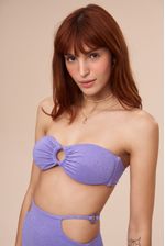 O top strapless ou top sem alça é o nosso antigo tomara que caia. Ele possui bojo e alças removíveis. O detalhe da maxiargola frontal de metal na cor roxa no centro do top é o charme desta peça. O tecido possui fios prateados de lurex que deixam a peça com um brilho suave. Barbatanas laterais e fecho metálico na cor dourada deixam o top mais estruturado. Na cor lavanda, um tom fascinante.