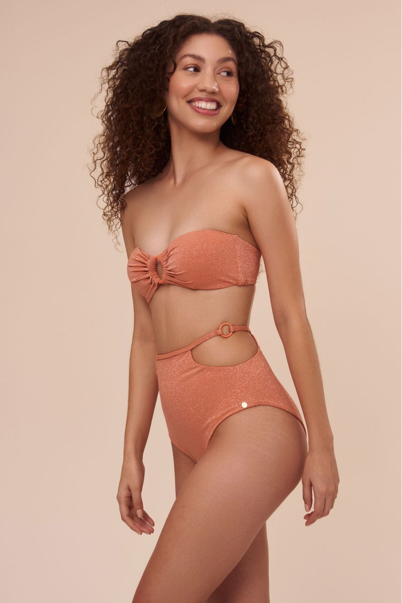 O top strapless ou top sem alça é o nosso antigo tomara que caia. Ele possui bojo e alças removíveis. O detalhe da argola frontal de metal na cor laranja no centro do top é o charme desta peça. O tecido possui fios prateados de lurex que deixam a peça com um brilho suave. Barbatanas laterais e fecho metálico na cor dourada deixam o top mais estruturado. Na cor papaya, um tom leve.
