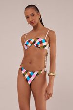 top biquíni sem bojo, modelo com aro, possui amarração com fecho traseiro em metal dourado, confeccionado com a técnica de upcycling, onde cada cor de tecido e cortada e costurada uma a uma artesanalmente, unidas através de um patchwork manual. um trabalho exclusivo e incrivelmente rico em detalhes. uma verdadeira joia do beachwear!