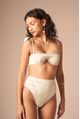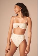 top de biquini modelo balconet com aro contínuo e sem bojo. alças fixas com detalhes de folhas de magnólia. o tecido é trabalhado e tem detalhes vazados como um macramê. nas cores off-white e areia, esta peça é fina e delicada.