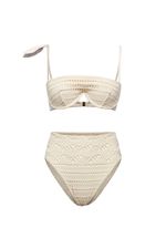 top de biquini modelo balconet com aro contínuo e sem bojo. alças fixas com detalhes de folhas de magnólia. o tecido é trabalhado e tem detalhes vazados como um macramê. nas cores off-white e areia, esta peça é fina e delicada.
