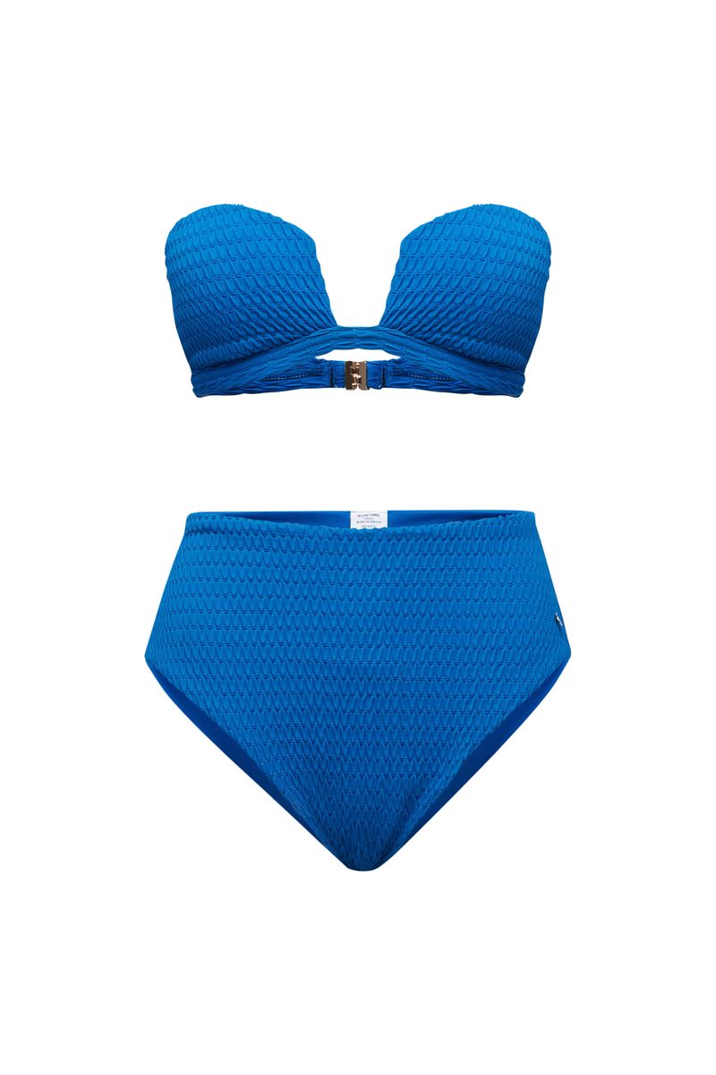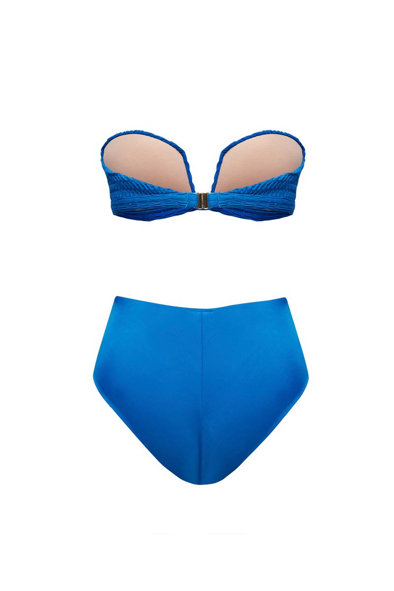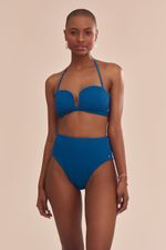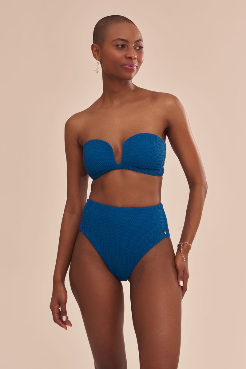 top com bojo demi, alça frente única removível e fecho de metal em banho dourado na parte de trás. o recorte diferenciado no centro do decote valoriza e traz sensualidade ao colo, sendo indicado para seios pequenos e médios. o tecido texturizado em forma de ondas traz relevo e enriquece o visual. a cor azul capri remete às praias parasidíacas do sul da itália.