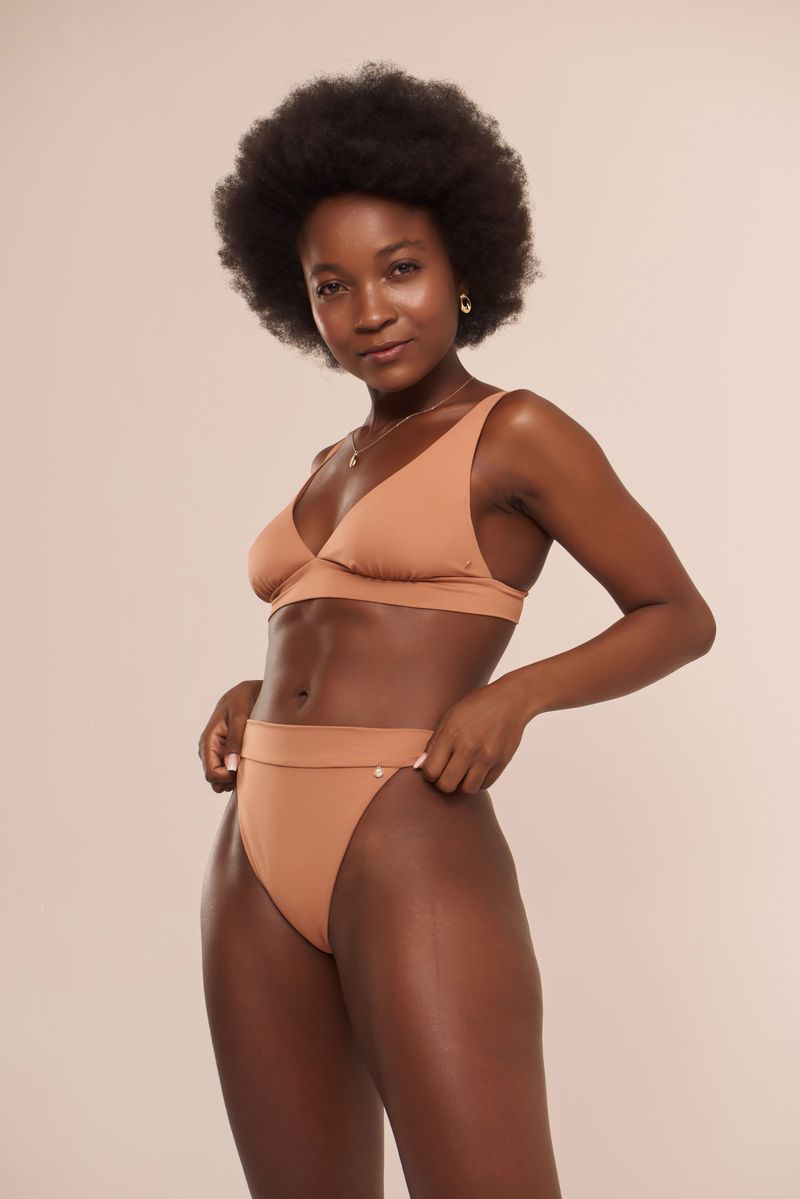 o top halter lari possui alças mais amplas com regulagem e detalhe franzido no bojo. o cós do top é largo e tem como acabamento um fecho metálico dourado.