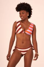 Top com amarração frontal com modelagem mais larguinha e decote em V frente e traseiro, as brincadeiras das listras deixam a peça mais alegre com a cara do verão solar.