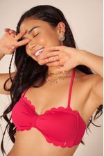 Top Tomara que caia com bojo e alça removível, o acabamento da peça é em recorte filmado, com detalhe em ondinhas. O nó do meio faz como a forma de um laço e seu acabamento nas costas é com fecho metálico dourado.