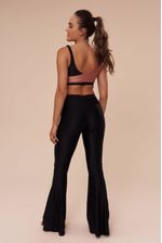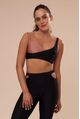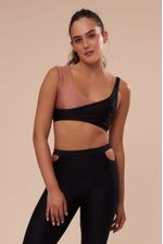 O top transpassado bicolor tem alças paralelas e uma das alças duplas com o detalhe de gota. Proporciona um ótimo suporte aos seios, pois é todo duplo e com um cós de elástico firme.