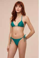 top triângulo ajustável com amarração nas costas e no pescoço. possui bojo. o acabamento de ponteiras douradas é o charme desta peça. a cor verde do tecido é puro luxo!