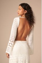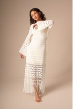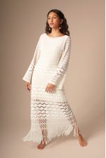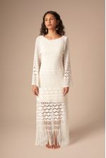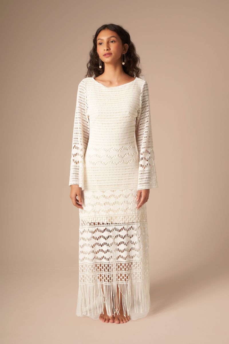 este vestido é puro charme: estilo boho, todo em macramê, com mangas longas e decote profundo nas costas. possui franjas na barra e pode ser usado em várias ocasiões. nas cores areia, off-white e preto, vai bem com qualquer tom de pele.