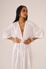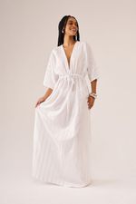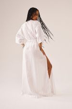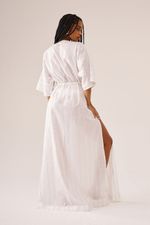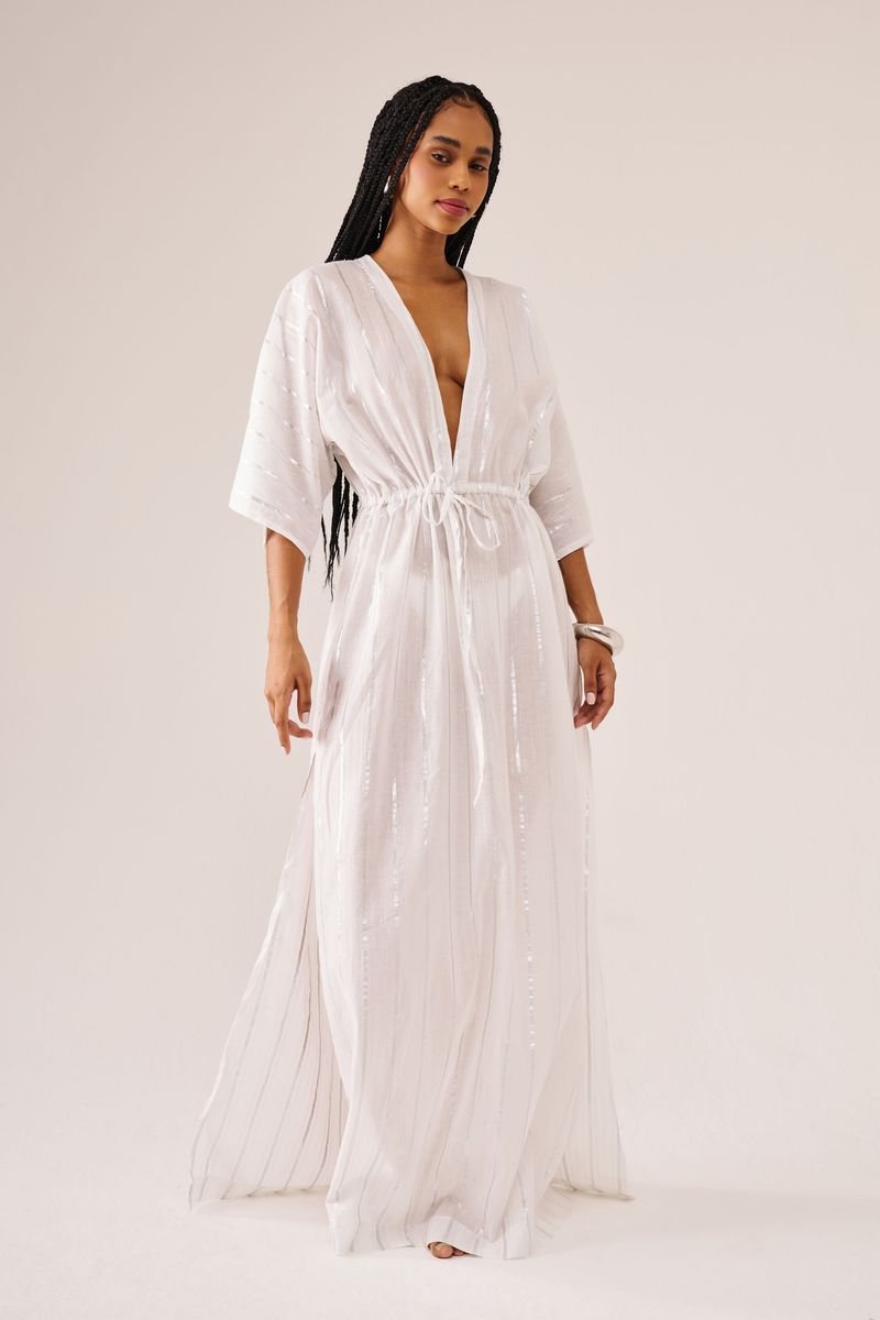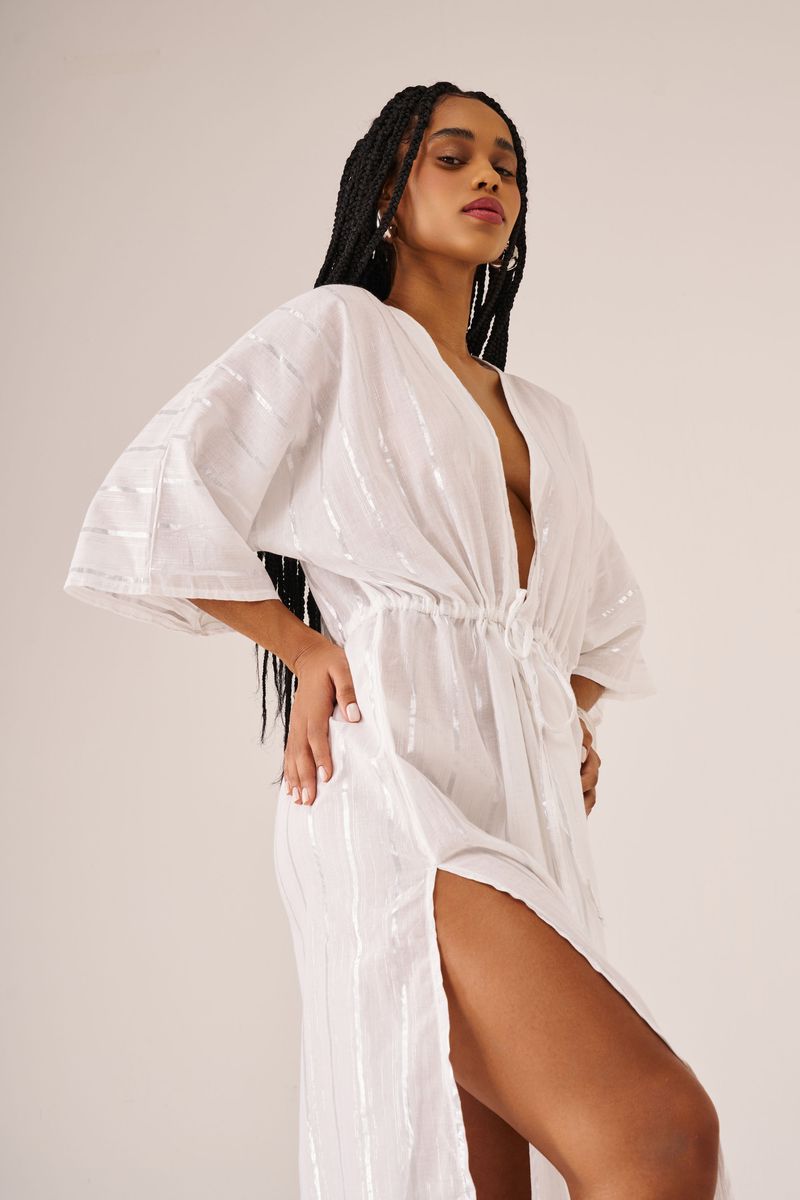 Esta peça pode ser usada como vestido ou saída de praia. Possui mangas mais soltas e decote V com amarração abaixo do seio. Fendas laterais arrematam a peça que tem filetes prateados e brilho.