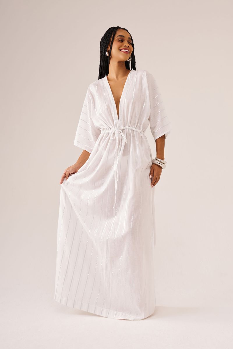 Esta peça pode ser usada como vestido ou saída de praia. Possui mangas mais soltas e decote V com amarração abaixo do seio. Fendas laterais arrematam a peça que tem filetes prateados e brilho.