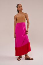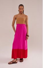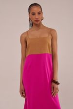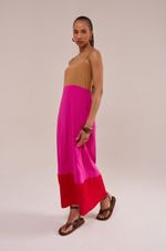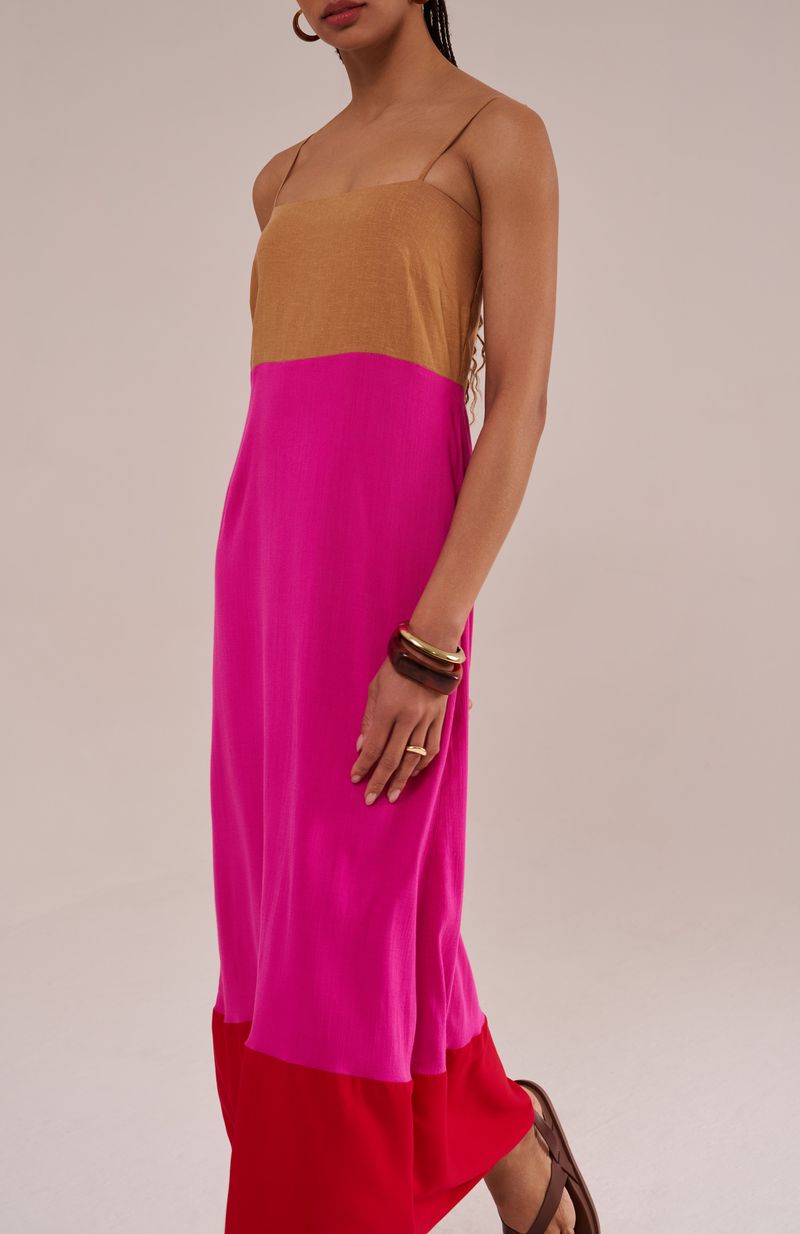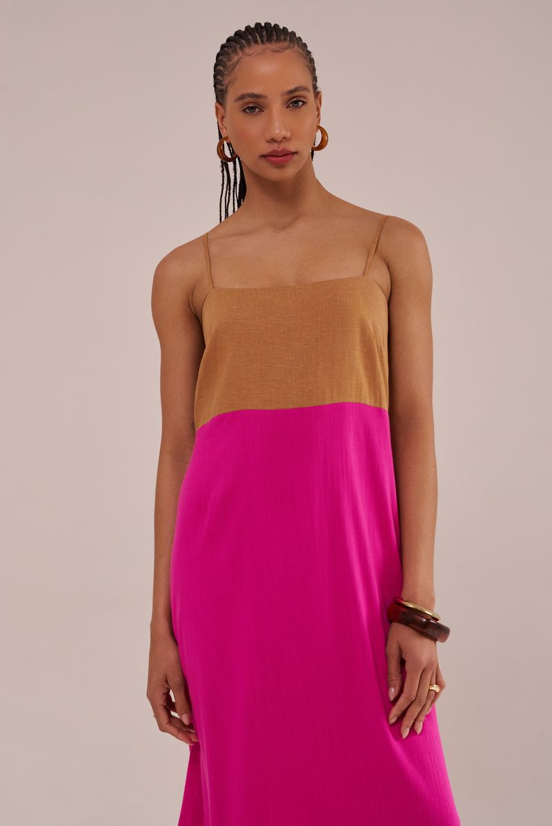 vestido com decote reto, modelagem super ampla, alças finas paralelas e ajustáveis, possui elástico nas costas para melhor caimento e fechamento por zíper, confeccionado em linho e viscose em três tons diferentes: caramelo, pink e vermelho, costurados horizontalmente formando largas listras. uma combinação incrivelmente bela e feliz. perfeita para o verão!